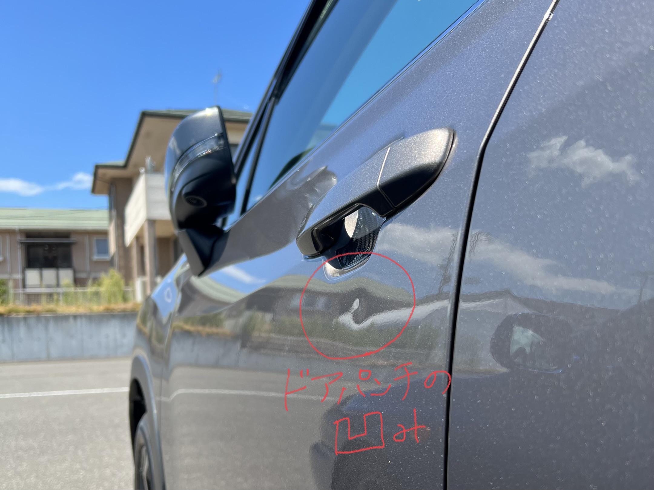 そしてドアパンチの傷があることに気づいていらっしゃらない方が多いです。写真のドアパンチはとってもわかりやすい凹みですが、凹みが小さいものや白やシルバーの車は凹みが見えにくいので査定士でもよ~く目を凝らさないと見つけられないことがあります・・・